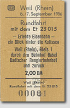 Im Rahmen der 1200-Jahr-Feier der Stadt Weil am Rhein veranstaltete die Deutsche Bundesbahn am 06. und 07.09.1986 Rundfahrten mit dem ET 25 015 a/b durch den Basel Bad Rbf. Die Fahrten wurden jeweils zur vollen Stunde von 10.00 - 17.00 Uhr durchgeführt. Fahrkarten